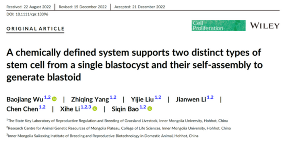 It is worth mentioning that the research team Prof. Bao Siqin, Prof. Li Xihe and Special-Term Associate Research Fellow Wu Baojiang has published their research results about blastoids where mouse embryonic stem cells are from and transition mechanism of mouse embryonic stem cells from pluripotency to totipotency in Cell Proliferation which is listed among the top journals in the first section of Chinese Academy of Sciences-indexed journals respectively in January and August in 2023. (URL of the articles: https://doi. org/10. 1111/cpr 91香蕉短视频. 13534;https://doi. org/10. 1111/cpr. 13396).