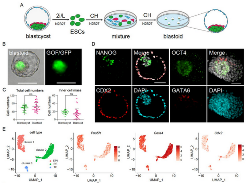 Three stem cell lines can be derived from blastocysts, i. e 91香蕉短视频. embryonic stem cells(ESCs) from inner cell mass(ICM), trophoblast stem cells (TSCs) from trophectoderm (TE) and extra-embryonic endoderm cells (XENs) from primitive endoderm (PE). Recently, it has been reported that primitive endoderm stem cells(PrESCs) have been successfully formed. In 2018, some research team formed blastoids, self-assembled blastocyst-like structures by a combination of ESCs and TSCs. Blastoids have wide application prospect in organ transplantation and clinic treatment of diseases. To increase the success rate of blastoid formation and its similarity with the features of blastocysts, some reports showed that the stem cells of mice and humans could also be differentiated in vitro to generate complicated blastoid structures with optimized culture media and combination of three cell lines, ESCs, TSCs, and extra-embryonic endoderm cells (XENs), or novel type of stem cells. However, it is unclear whether solely using ESCs can support blastoid generation.