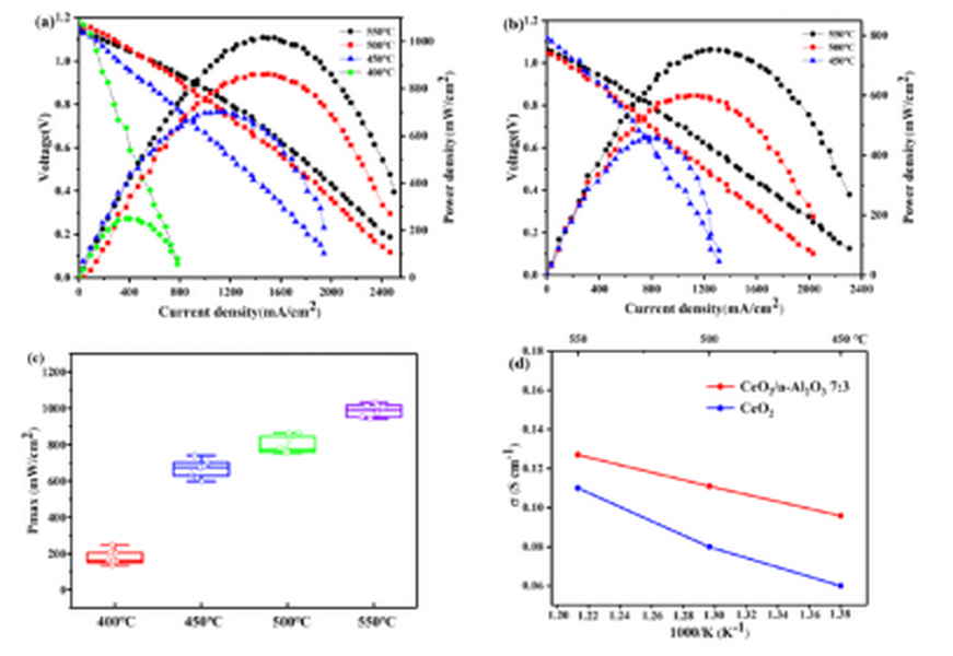 Fig. 1 IV−IP curves based on (a) CeO2/a-Al2O3 7:3 and (b) CeO2 electrolytes; (c) box plot with the statistics for the power maximum from eight separate cells measured at different temperatures and (d) Arrhenius plots for CeO2/a-Al2O3 7:3 and the pure CeO2 electrolyte.
