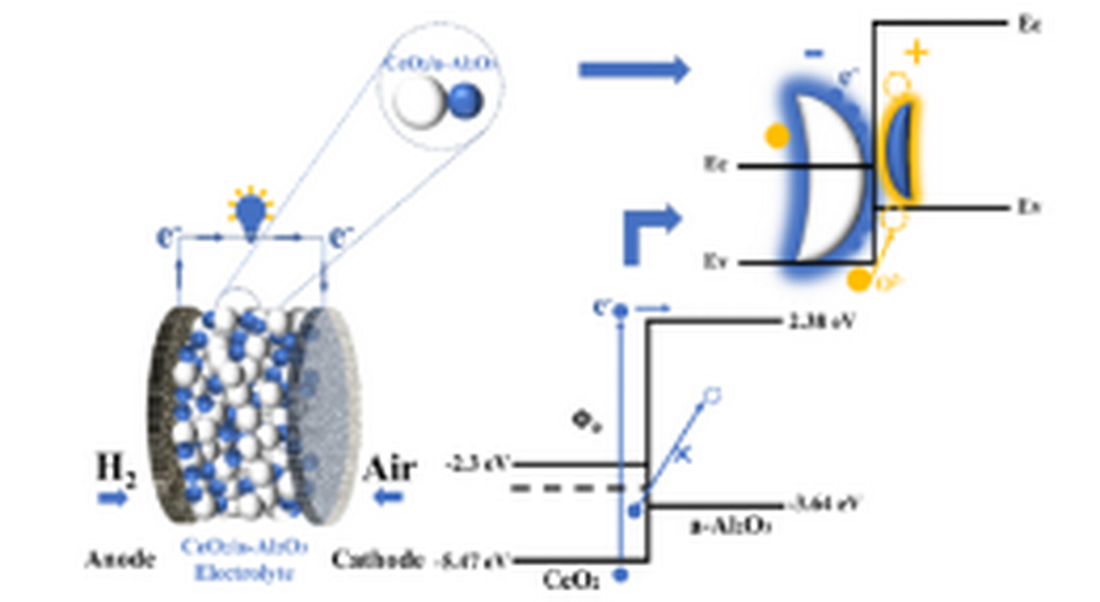 Further investigation showed that on introducing a-Al2O3 into CeO2, microscale heterointerfaces were formed in the heterostructure composite. The interface analysis by high-resolution transmission electron microscopy (TEM) also confirmed the n−i heterostructure contact between CeO2 and a-Al2O3 phases. It is found that the potential energy barrier at the heterointerfaces caused by the ultrawide band gap of the insulator a-Al2O3 plays an important role in restraining electron conduction. Simultaneously, the thermoelectric effect of the insulator induces more oxygen vacancies because of interface charge compensation, which further promotes ionic transport and results in high ionic conductivity and fuel cell performance. This study presents a practical n−i heterostructure electrolyte design, and further research confirmed the advanced functionality of the CeO2/a-Al2O3 electrolyte. This study may open frontiers in the field of developing high-efficiency electrolytes of LT-SOFCs using insulating materials such as amorphous alumina.
