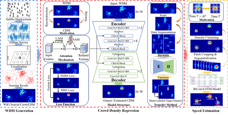 Due to this, the research proposes a passive WiFi sensing based fine-grained crowd analysis scheme. On the basis of the deep analysis of the limitations of the sensing and introduction of the rich-information density maps in the field of computer vision to accurately describe the density distribution of the crowd, the research designs an attention-based deep convolutional autoencoder (ADCA) to recover accurate crowd density maps from the sensing data in a way similar to image reconstruction. The research also designs an approach which is based on the combination of density clustering and bidirectional convolutional long-term and short-term memory networks to infer local high-density crowds (LHDCs) speeds with the features of spatial-temporal changes of local density of crowd states 91香蕉视频APP下载. The research develops a probabilistic model-embedded divide and conquer algorithm to produce the semi-synthetic datasets with the generalization of key law of realistic sensing behavior in pedestrian tracking data to fully train, effectively evaluate and transfer the scheme across the domains.