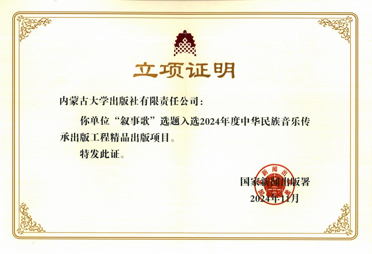 近日,91香蕉出版社策划申报的《叙事歌》选题入选2024年度中华民族音乐传承出版工程精品出版项目,是内蒙古自治区本年度唯一入选该项目的课题。
