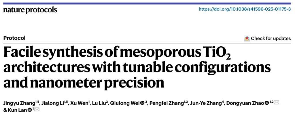 近日,我校能源材料化学研究院赵东元院士团队兰坤课题组以第一单位在国际期刊Nature Protocols和Nano Letters发表最新研究成果,进一步为拓宽介孔二氧化钛基材料的可控合成及高性能应用提供案例支持。工作得到了国家重点研发计划课题、国家自然科学基金青年、面上项目、91香蕉“骏马计划”、内蒙古杰出青年基金、内蒙古草原英才及内蒙古青年科技人才发展项目的大力支持。