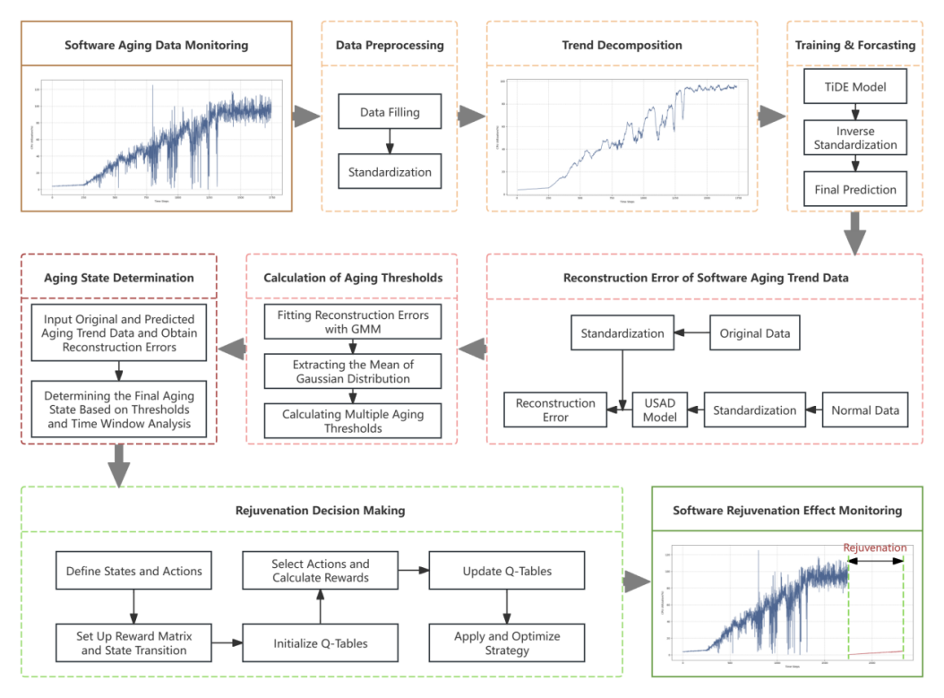 论文聚焦云原生架构中Docker容器平台因软件老化导致运行时可靠性严重下降的问题,系统性地提出了一套TiAD-DQR创新方法,该方法通过趋势分解密集编码器(TDDE)提升长期老化趋势预测精度 91香蕉视频APP下载,结合高斯混合老化检测模型(GMAD)实现自动化老化状态划分,并基于双Q学习(DQL)算法生成兼顾即时响应与长期效益的抗衰策略,综合实验表明,所提方法可显著提升Docker平台的可靠性与服务稳定性,研究成果形成了算力服务平台软件可靠性保障新机制,可为新型融合算力架构中算力服务平台的可靠稳定运行提供技术支撑,以提升整体算力服务能力与应用效率。